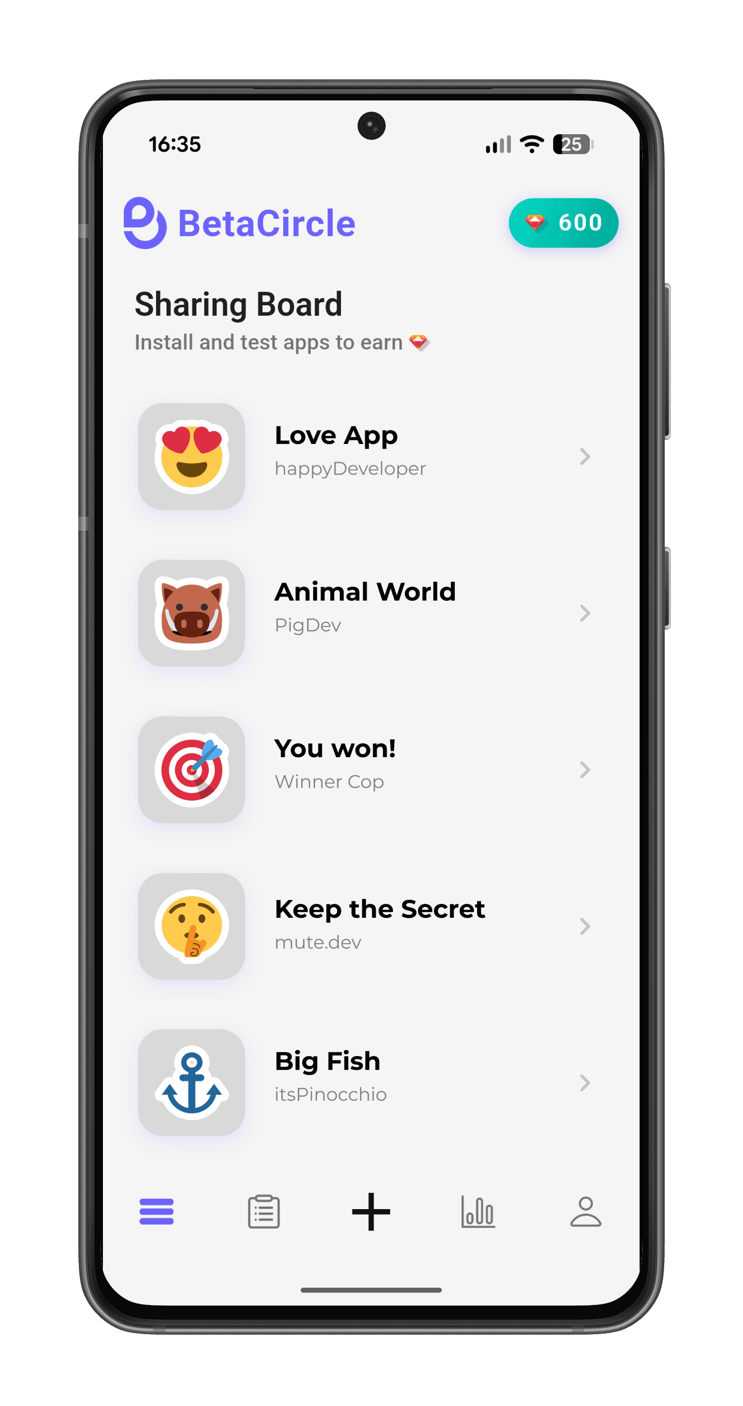 Download and test apps of other developers from the BetaCircle App to earn diamonds