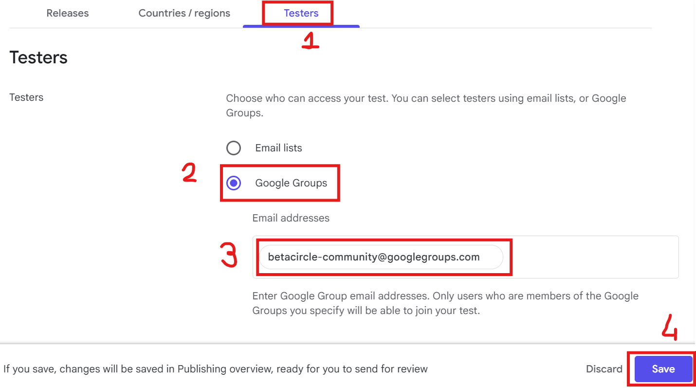 Google Play allows you to use Google Groups as tester lists. This is extremely useful if you want many people to join your test without manually adding each email. In this case, BetaCircle works properly with app in closed testing only when each user has added our Google Group in the testers section.
