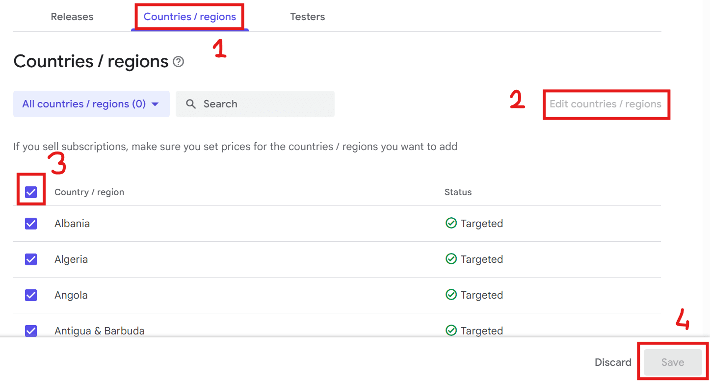 To increase the chances of attracting new users, it is recommended to add all countries to the testing phase: